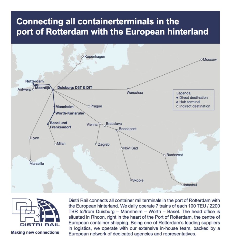 Elk jaar voegen wij diverse bestemmingen toe aan ons netwerk. Zo verbinden wij de haven van Rotterdam, Moerdijk en Antwerpen hoogfrequent met alle uithoeken van het Europese achterland (Rusland, Polen, Turkije, Frankrijk, Duitsland, Italië, Roemenië, Denemarken, Hongarije, Oostenrijk, Tsjechië, Kroatië, Servië, Slowakije, Zwitserland).